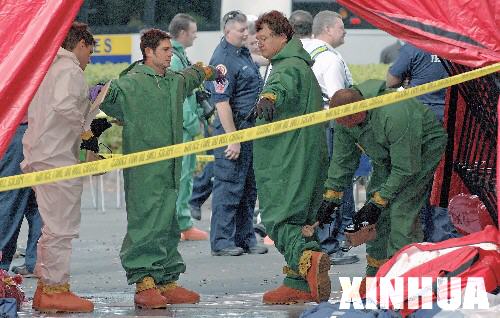在美國(guó)佛羅里達(dá)州的杰克遜維爾市,從發(fā)生爆炸的尤尼森工業(yè)公司走出的救援人員接受輻射檢查